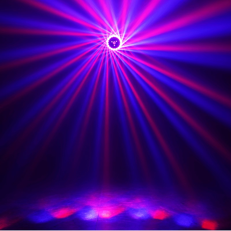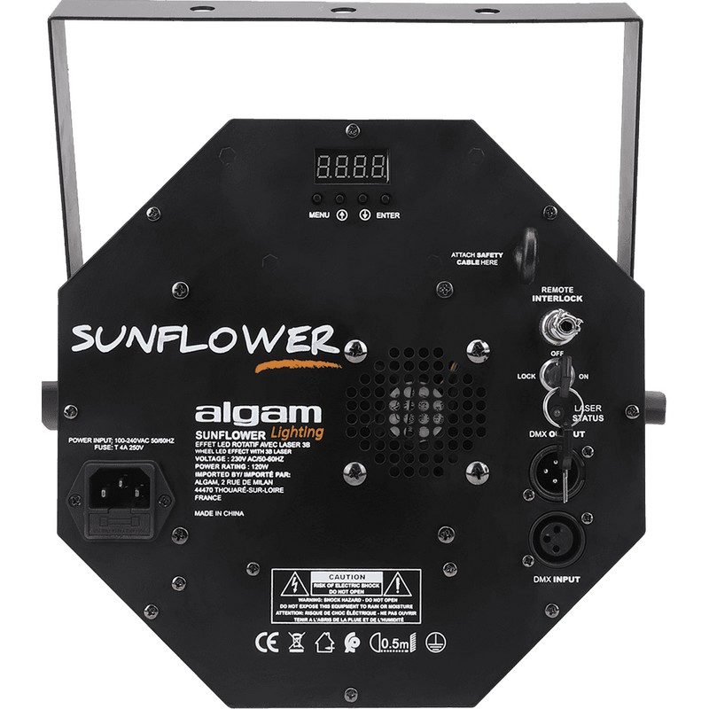 La combinaison de son prisme rotatif à 18 Leds RGB de 3 watts chacune, de son stroboscope de 3 Leds blanches de 20 watts et de son laser vert de 150mW offre des effets de couleurs multiples d’une puissance et d’un dynamisme incroyables pour animer vos soirées. Simple d’utilisation, proposant de nombreux programmes internes pour un fonctionnement automatique ou au rythme de la musique, un mode maître/esclave, le Sunflower est pilotable via DMX.