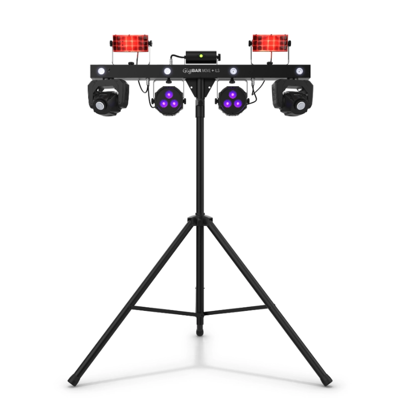 GigBAR Move + ILS est un système 5-en-1 qui regroupe des lyres automatiques, des derbies, des washs, un laser et un effet de strobe, tous prémontés sur la même barre.