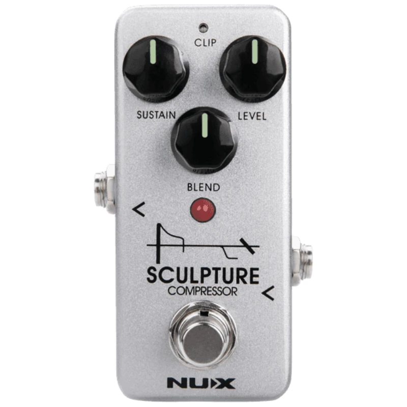 L’effet de compression est souvent opaque et mal compris des guitaristes, mais c’est pourtant une arme secrète très inspirante pour ajouter du claquant et du sustain à votre son ! Un compresseur « nettoie » les notes fortes (crêtes) et augmente le niveau des notes plus silencieuses, harmonisant les écarts de dynamique pour faire ressortir toutes les notes jouées. La mini pédale Nux Sculpture compressor est très compacte mais offre des fonctionnalités étendues pour un compresseur de son gabarit. Les trois potentiomètres contrôlent le sustain (compression), le level (volume du signal compressé) et le blend (mix entre votre signal pur et le signal compressé) permettant de garder graduellement plus de naturel et d’attaque à votre son. Ce bouton de mix permet déjà beaucoup de nuances mais le Sculpture va plus loin en proposant deux modes de compression sélectionnables via un appui d’une seconde sur le footswitch. Le mode « clean » soft clipping va permettre de couper les bords supérieurs et inférieurs du signal de manière « douce et progressive ». Le mode hard clipping lui va tailler de manière nette et radicale le haut et le bas du signal pour une compression plus brute. Enfin, cette pédale astucieuse offre la possibilité de sélectionner un true bypass ou un buffer suivant votre configuration de jeu (sélection en maintenant le footswitch et alimentant la pédale). Le Nux Sculpture est donc une mini pédale de compression complète avec un très bon rapport qualité/prix !