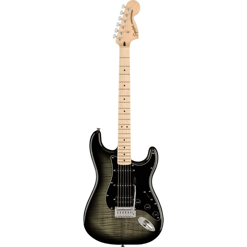 La Squier Affinity Series Stratocaster s’inscrit dans la grande tradition Strat : ergonomie immédiate, contours confortables et palette sonore capable de couvrir un large répertoire. Dans cette version FMT, Squier ajoute une touche plus ” premium ” avec une table en érable flammé et une approche résolument moderne : corps fin et léger, vibrato 2 points et mécaniques à arbres fendus pour faciliter l’accordage et les changements de cordes.