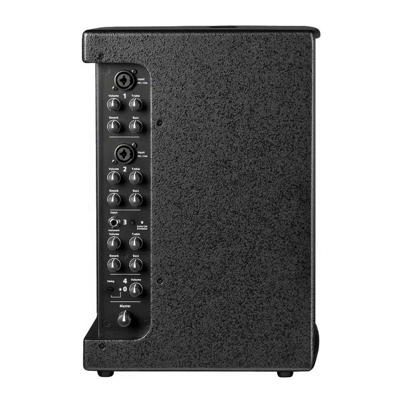 Deux entrées combo XLR/jack accueillent micros et sources ligne, une entrée instrument dédiée et un auxiliaire minijack stéréo complètent la section. Chaque voie dispose d’un EQ 2 bandes et d’une réverbe, avec multi-effet et anti-larsen pour sécuriser le set.