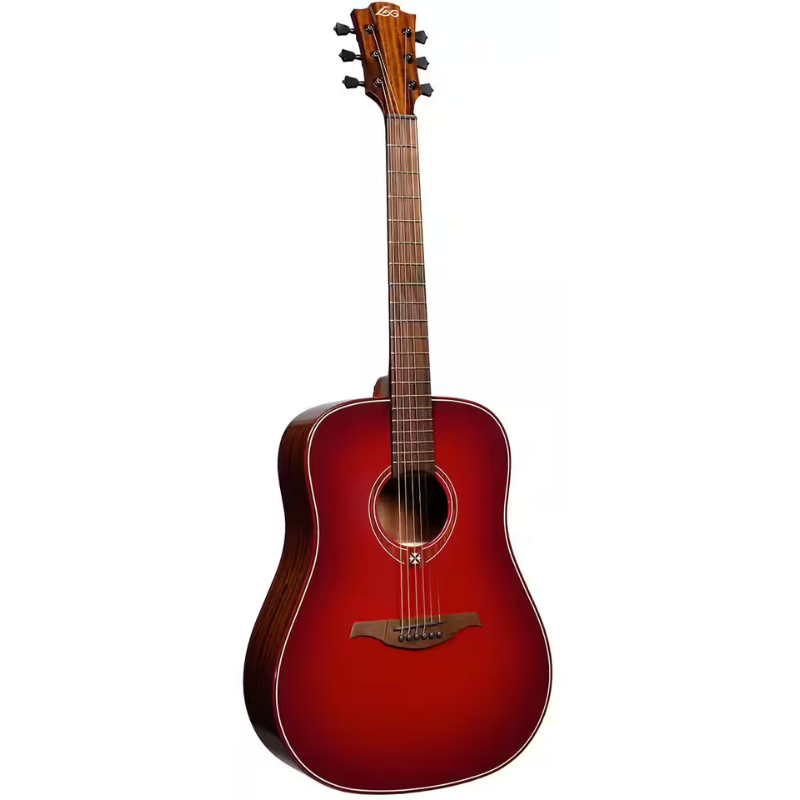 Cette Special Edition apporte un coloris exclusif à la famille Tramontane. Elle reprend les codes qui ont fait le succès de la gamme Lâg (choix d’essences soignées, finitions élégantes) et les habille d’un vernis ” Red Burst ” harmonisé au khaya brillant, y compris sur la tête typique Lâg. Cette fiche concerne la version acoustique au format dreadnought.