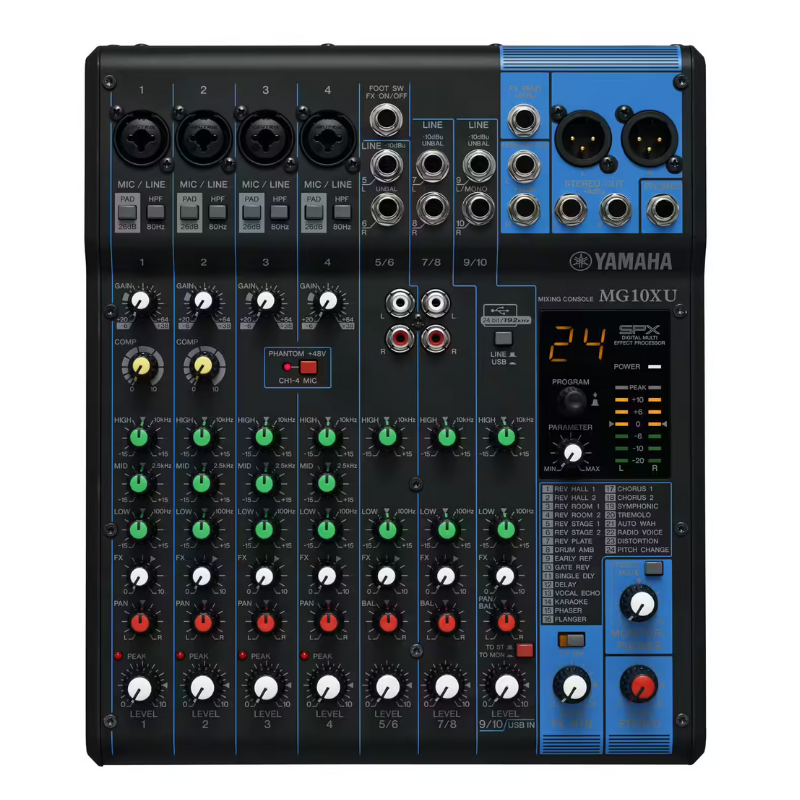 Le moteur SPX embarque 24 programmes soignés (réverbes, délais, modulations) pour sublimer voix et instruments sans matériel additionnel. L’auxiliaire dédié facilite l’envoi d’effets et les retours musiciens.